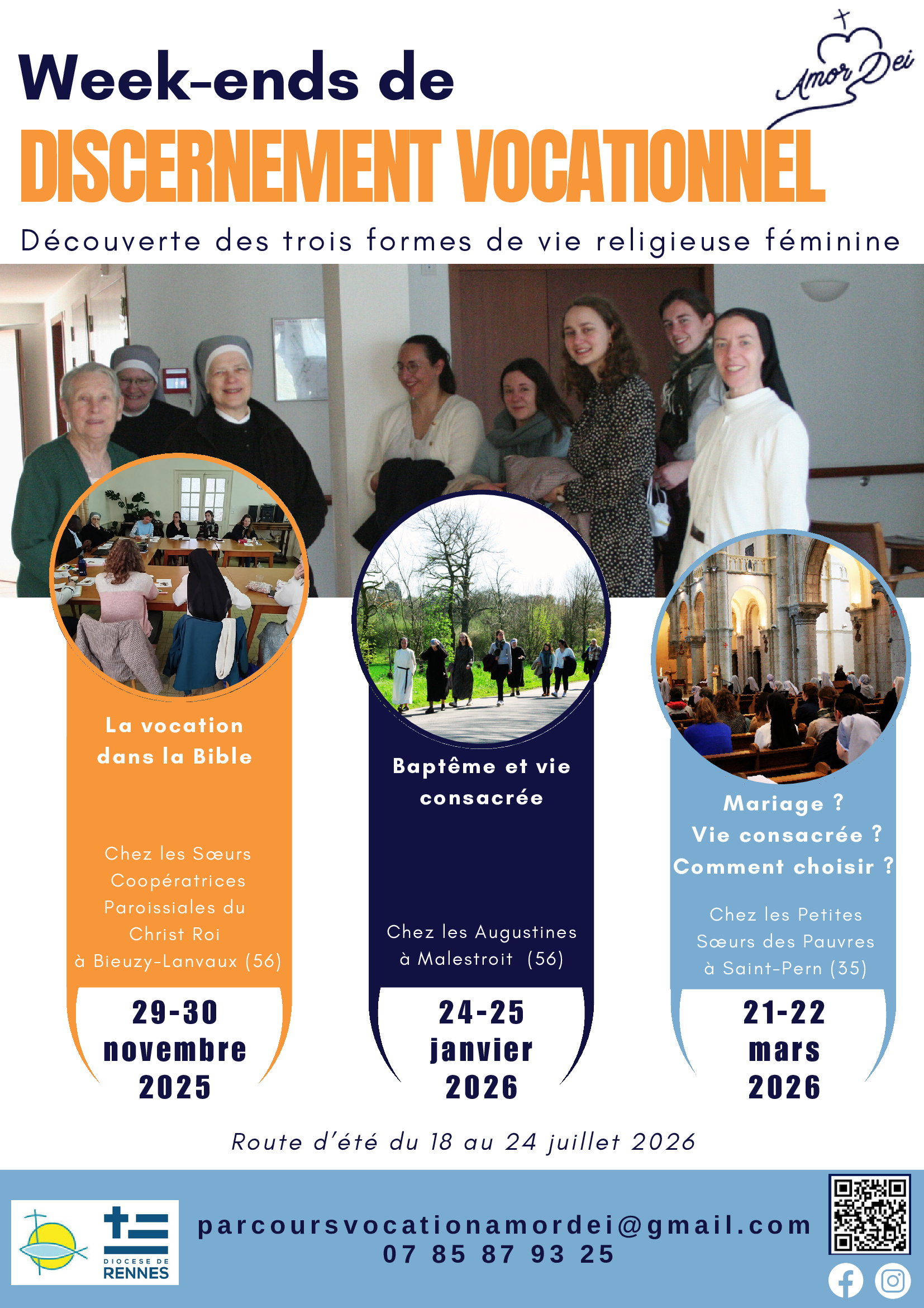 - Le week-end des 21-22 mars 2026 à Saint-Pern (35), chez les Petites Sœurs des Pauvres. Le WE sera animé par Mme Napoléoni, sur le thème « Mariage, vie consacrée: quelle vocation pour moi ? »