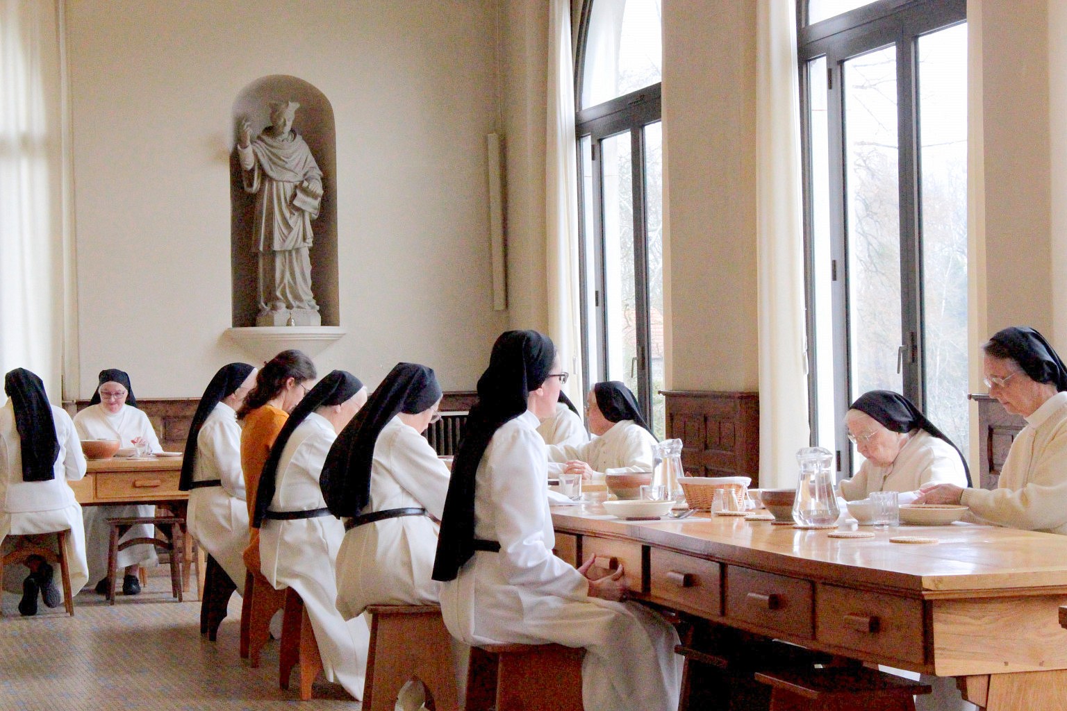 Les repas se passent en silence, avec une lecture. A midi, la sœur lectrice lit des articles d’actualité ou de fond de son choix.