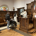 Pour l'occasion, un temps de prière était organisé à la chapelle, auquel étaient invités les patients qui le désiraient et leurs proches, soit par l'intermédiaire de la chaîne interne qui relie la chapelle à leur télévision, soit en présentiel: Les apprentis aide-soignants et des sœurs venaient les chercher dans leur chambre et les accompagnaient tout au long de cet après-midi.