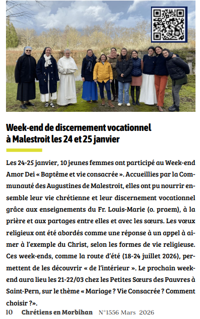 Voici la brève parue dans Chrétiens en Morbihan, à propos du WE Amor Dei qui a eu lieu fin janvier au Monastère: