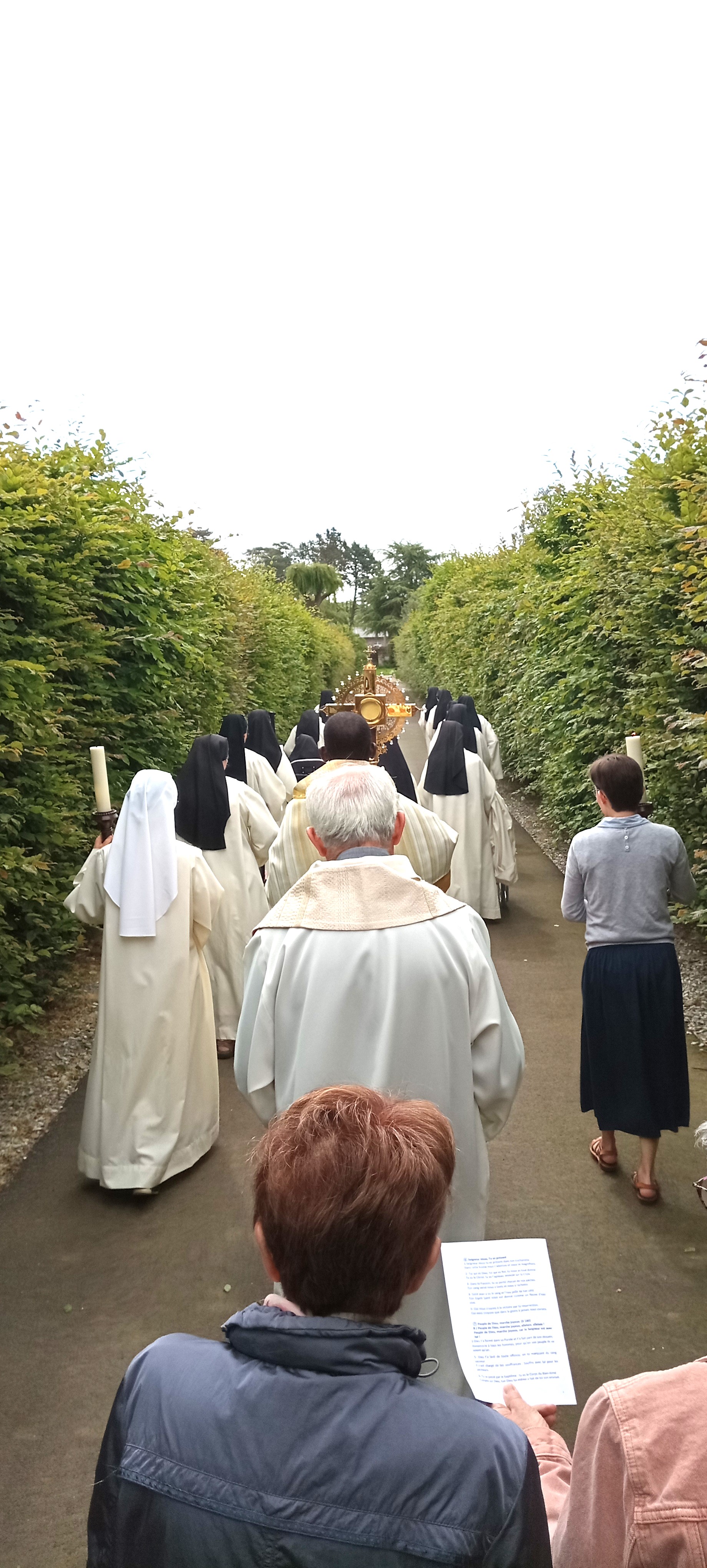 Cette année encore, nous sommes partis en procession dans le Jardin de la Communauté en chantant, jusqu'au reposoir. Le Père Michel a béni les patients de la Clinique qui participaient à l'Eucharistie et à la procession avant leur retour dans les services, ainsi que tous les fidèles présents, puis nous sommes repartis vers la Chapelle .