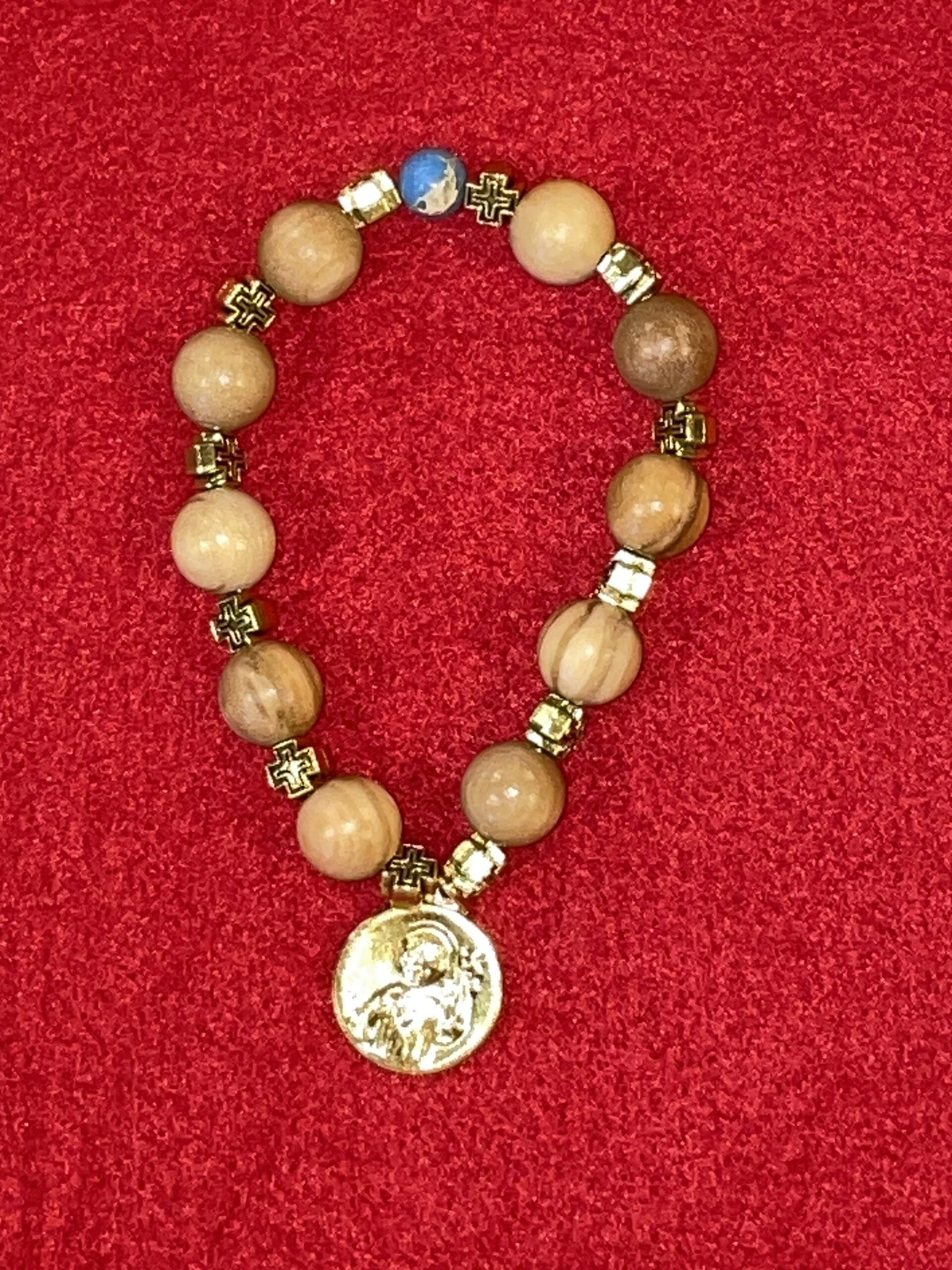 Prix : 14€Chapelet en bois fabriqués avec des perles et une croix en bois en provenance de Terre Sainte (photo non contractuelle : la forme de la croix peut varier, corde noire, marron ou blanche). Avec une médaille de Jésus, roi d’amour.